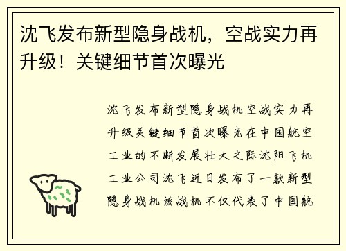 沈飞发布新型隐身战机,空战实力再升级!关键细节首次曝光